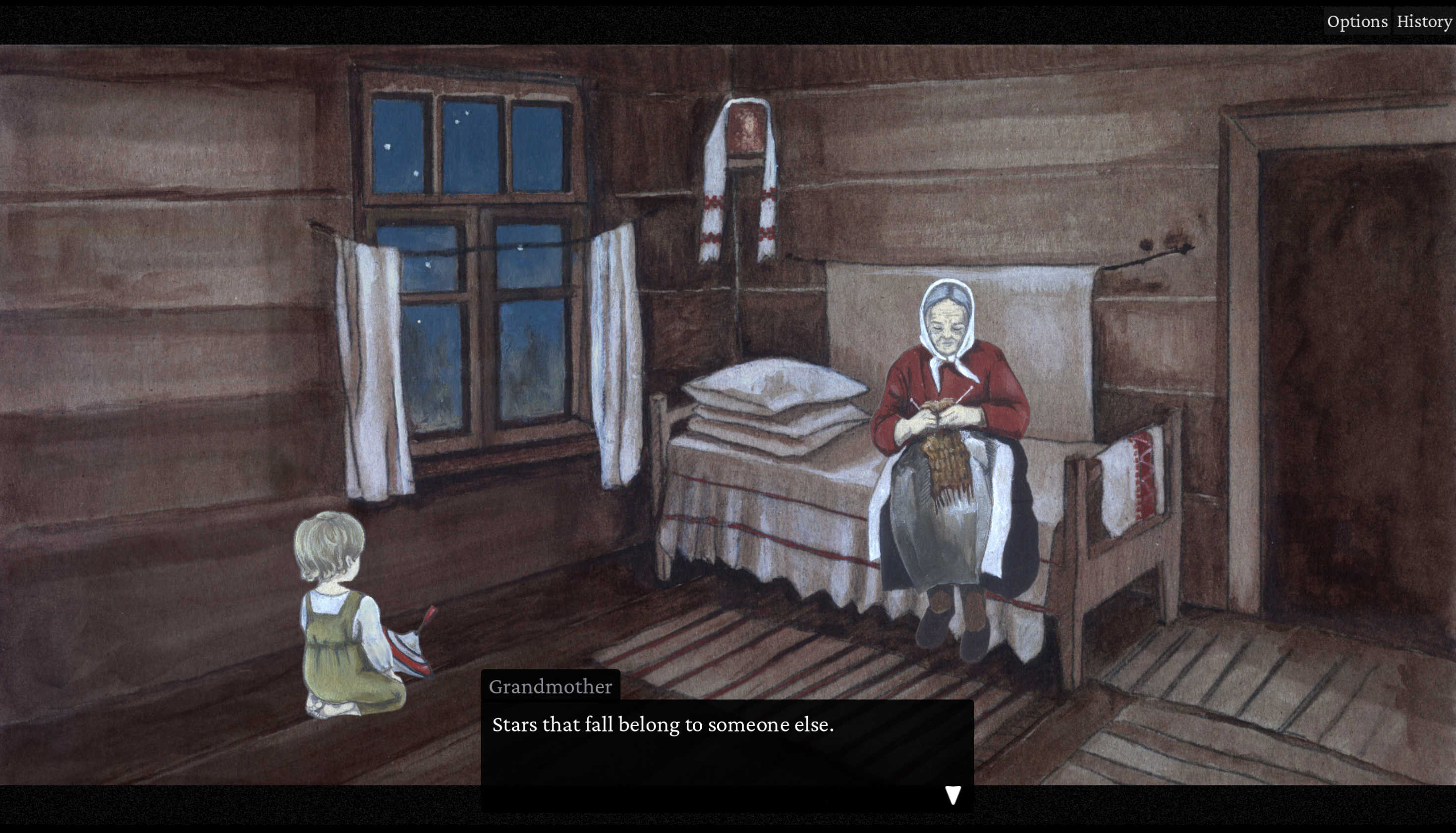 What absolutely gorgeous game!!! Your artwork is incredible and solemnly bittersweet in just the right way - at times some of the landscapes reminded me of Rien Poortvliet's work, especially with your trees and grasses. And the writing blended with it so beautifully...... especially for a two-person team, this is a stunning work. Huge congratulations on the entry!!